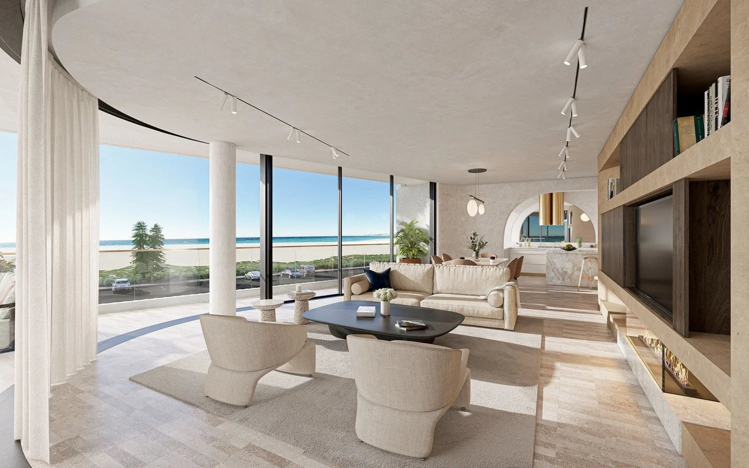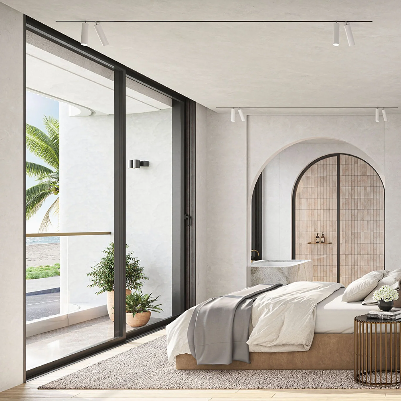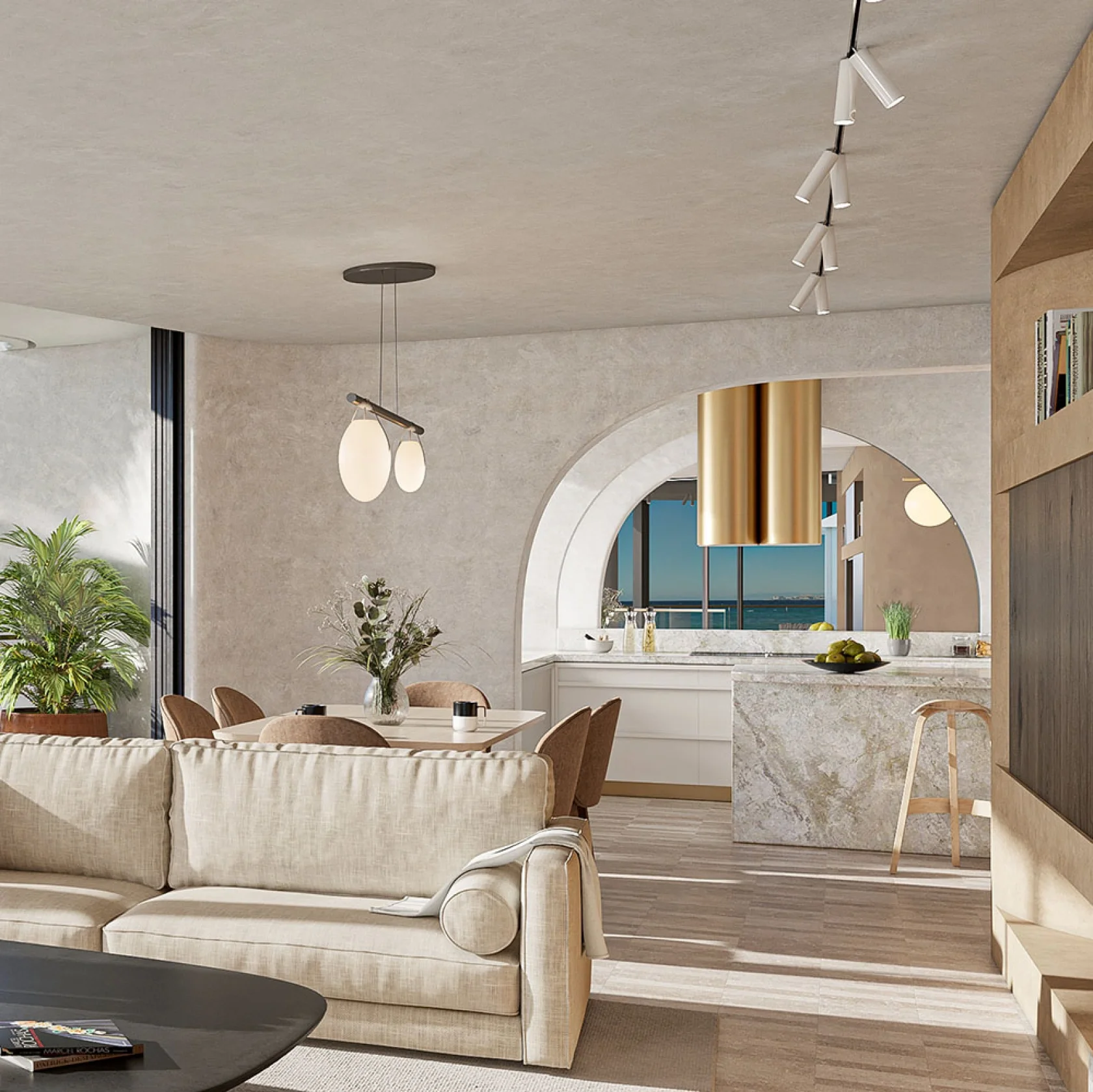 The carefully selected material palette of washed-out terracotta, concrete, marble and natural textures it evoke the coastal location in a soft way that has hints of warm veins that captures the spirit of the building exterior and extends this language into the internal spaces.
