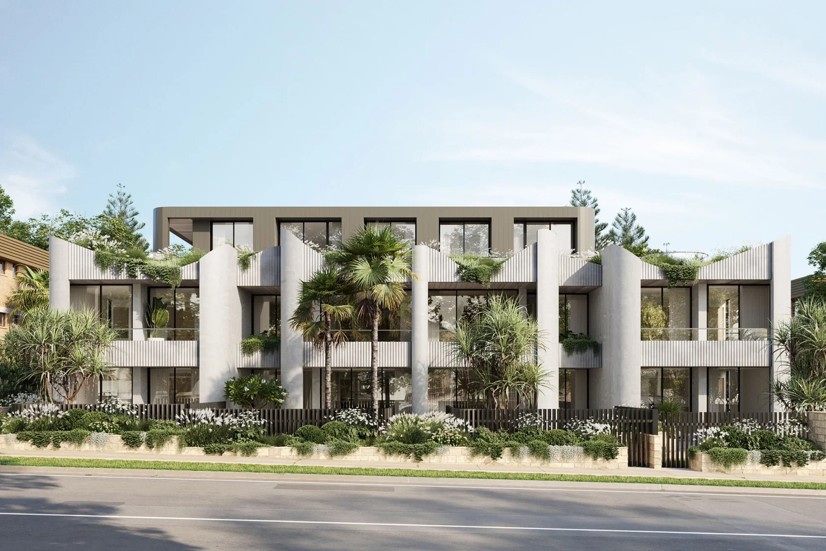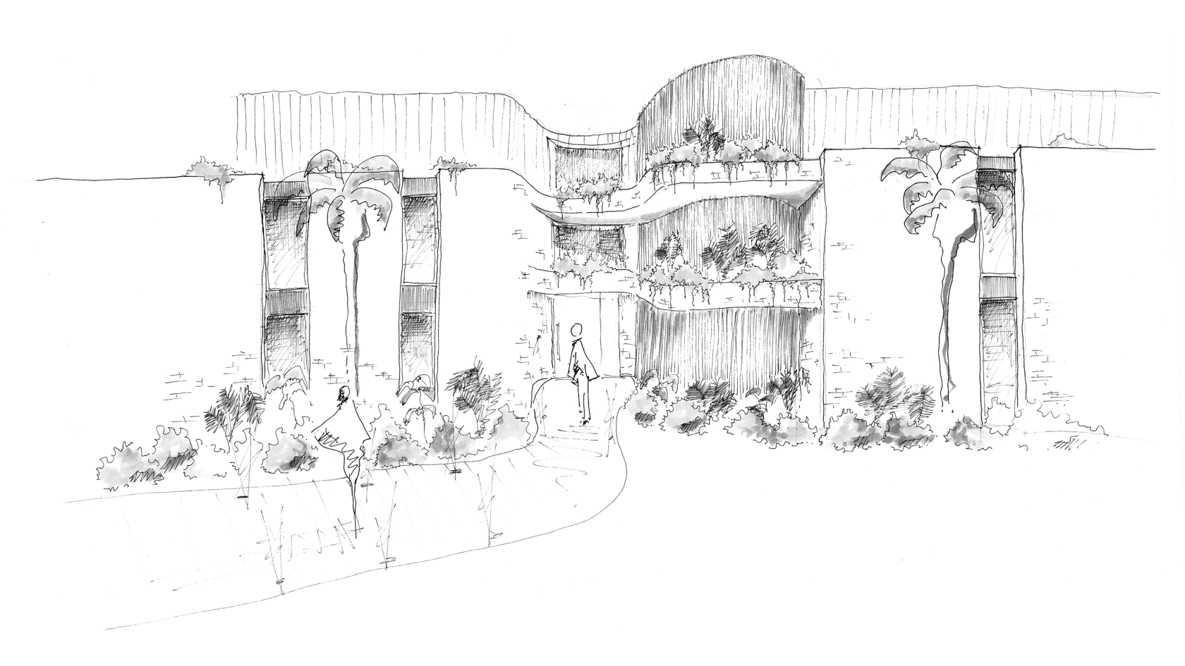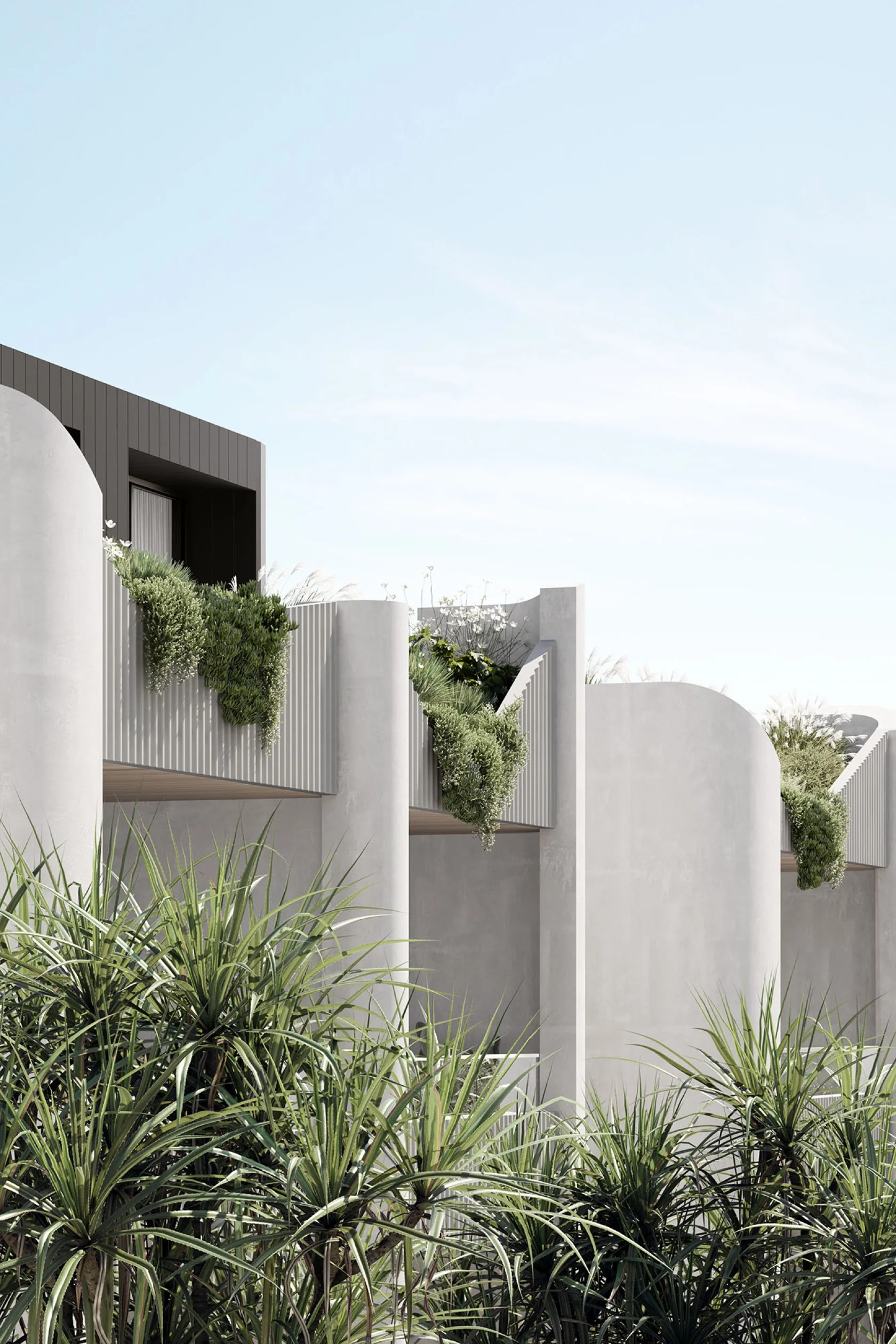Atop the building, residences spill to wrap-around terraces and private gardens. Formed concrete columns gently enfold the spaces like the curving coast.