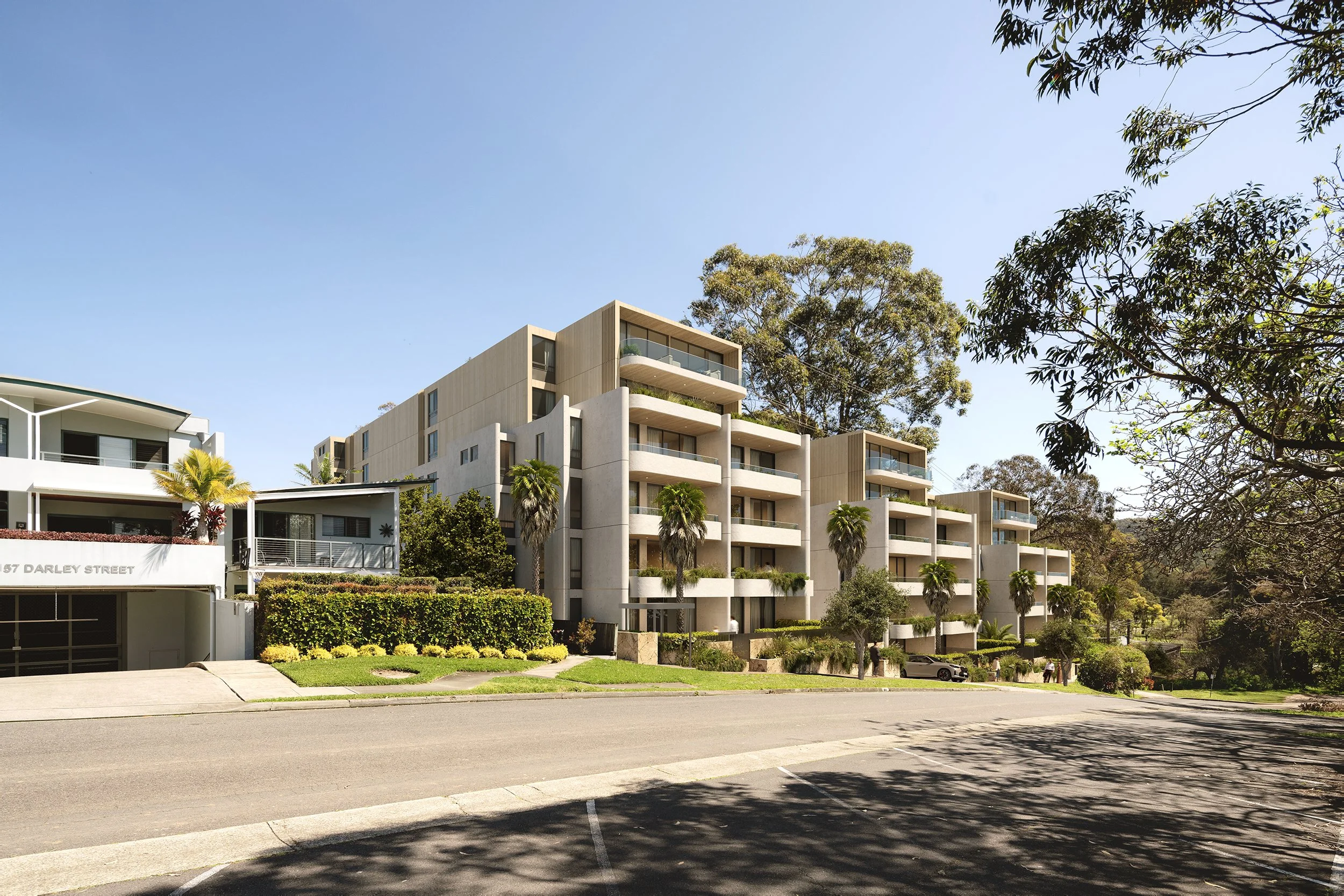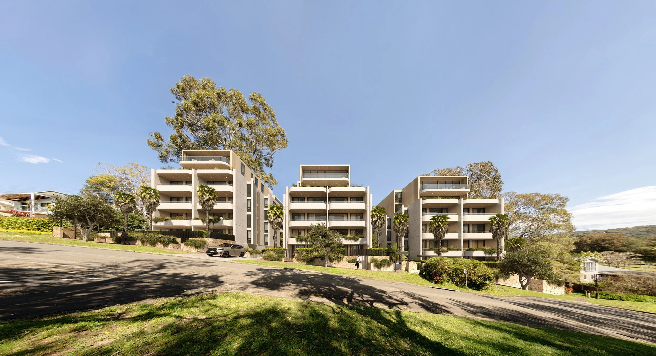 Set within the evolving fabric of Mona Vale, the Darley Street Residences are shaped by their relationship to landscape, light, and the relaxed coastal character of Sydney’s Northern Beaches. The design brings together a series of carefully composed residential buildings that respond to the site’s natural topography while maintaining a strong connection to the surrounding neighbourhood.
