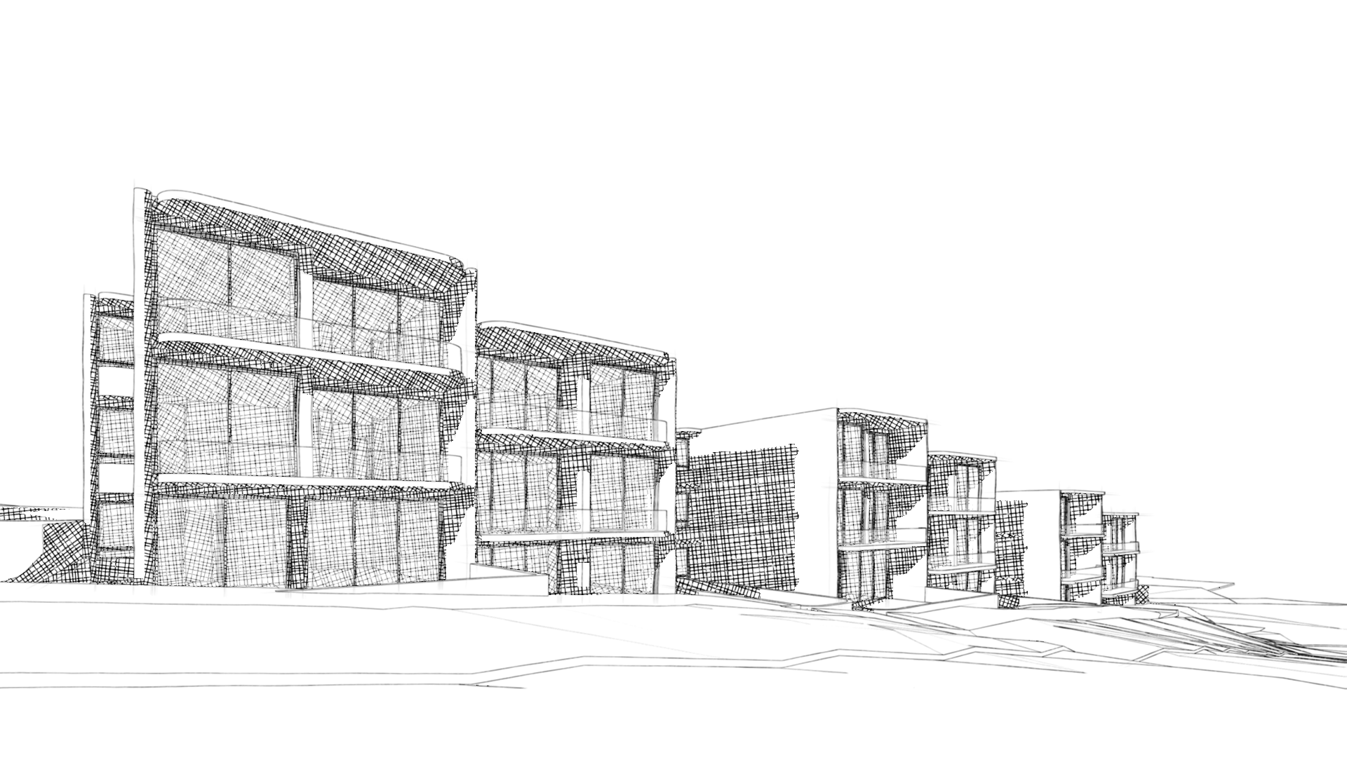The architecture is grounded in a careful reading of the site and its immediate surroundings. Framed by established streets and mature vegetation, the development adopts a stepped form that follows the natural contours of the land. This approach allows the building to sit comfortably within the landscape, reducing visual bulk while creating a rhythm of terraces and recesses that soften its presence along the street.