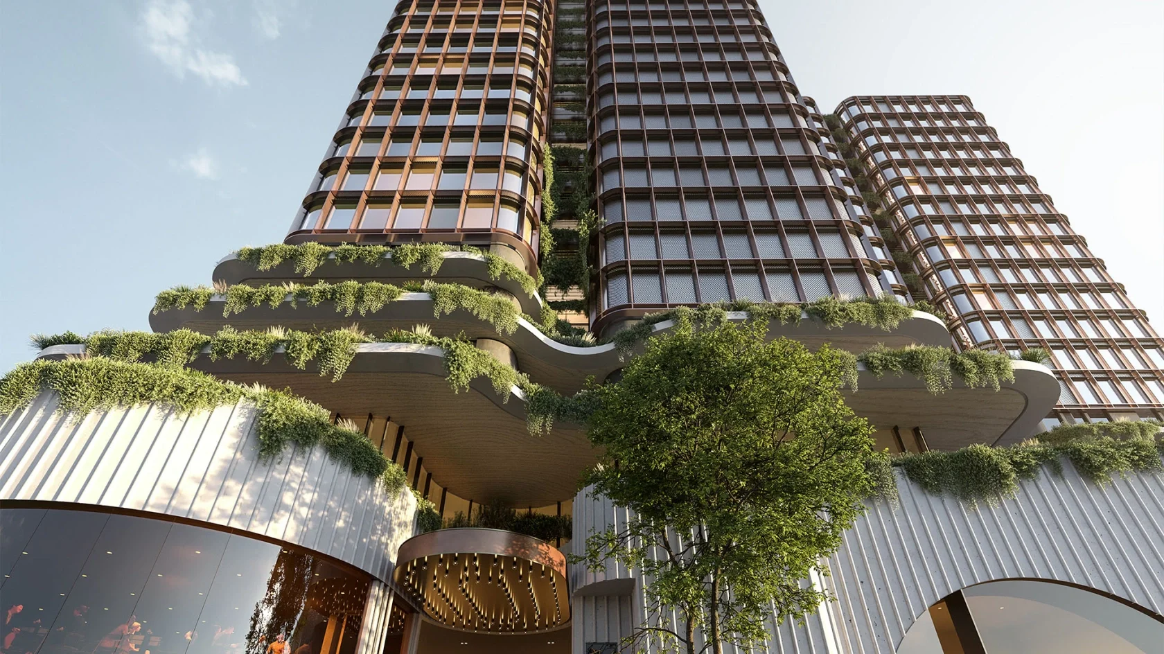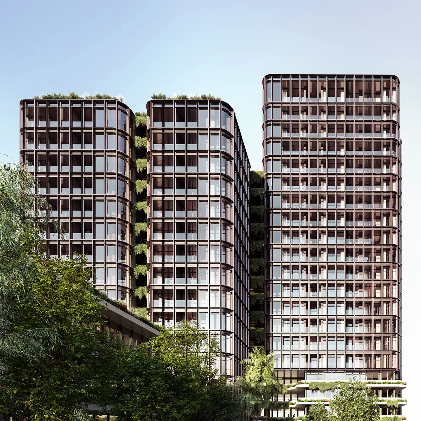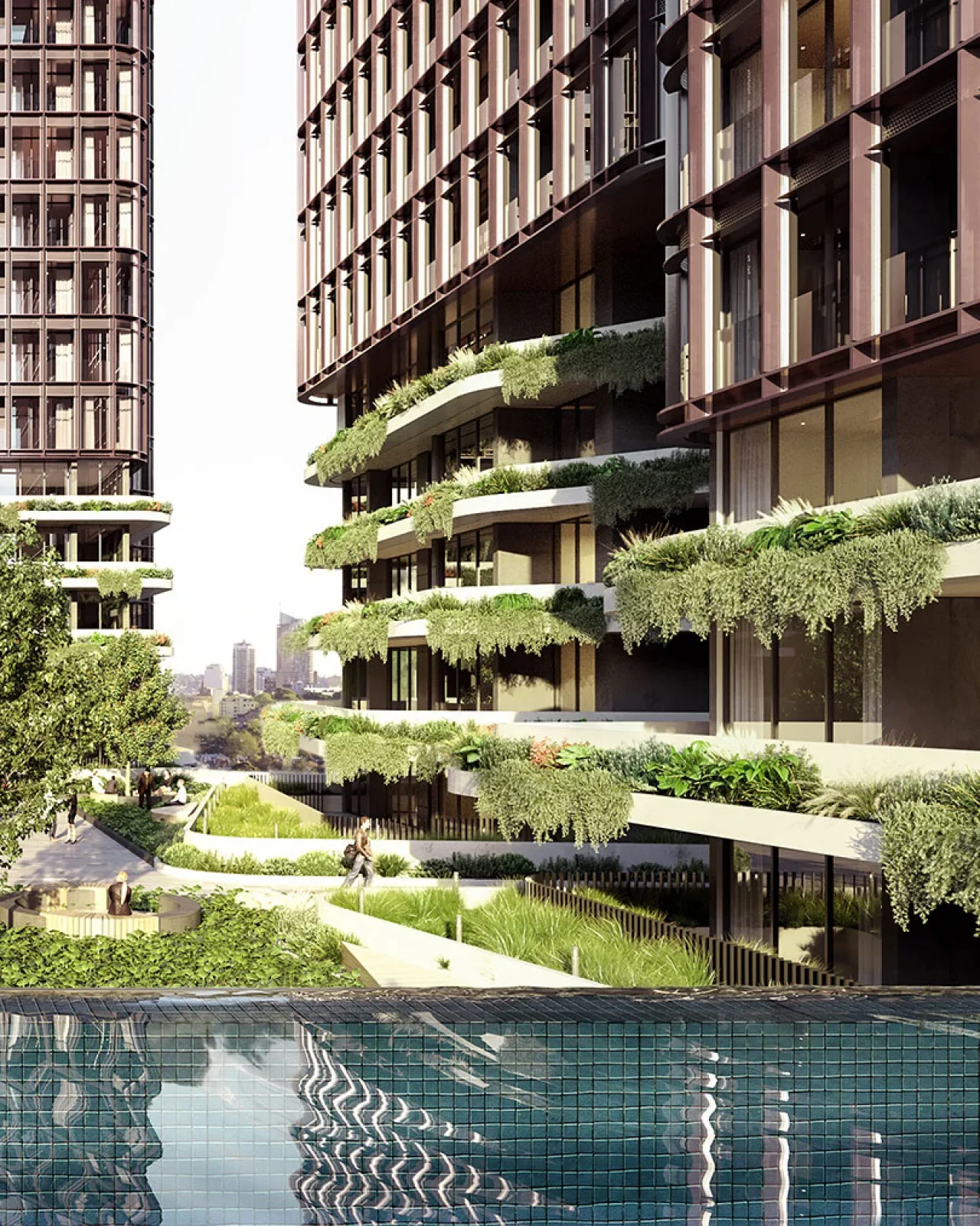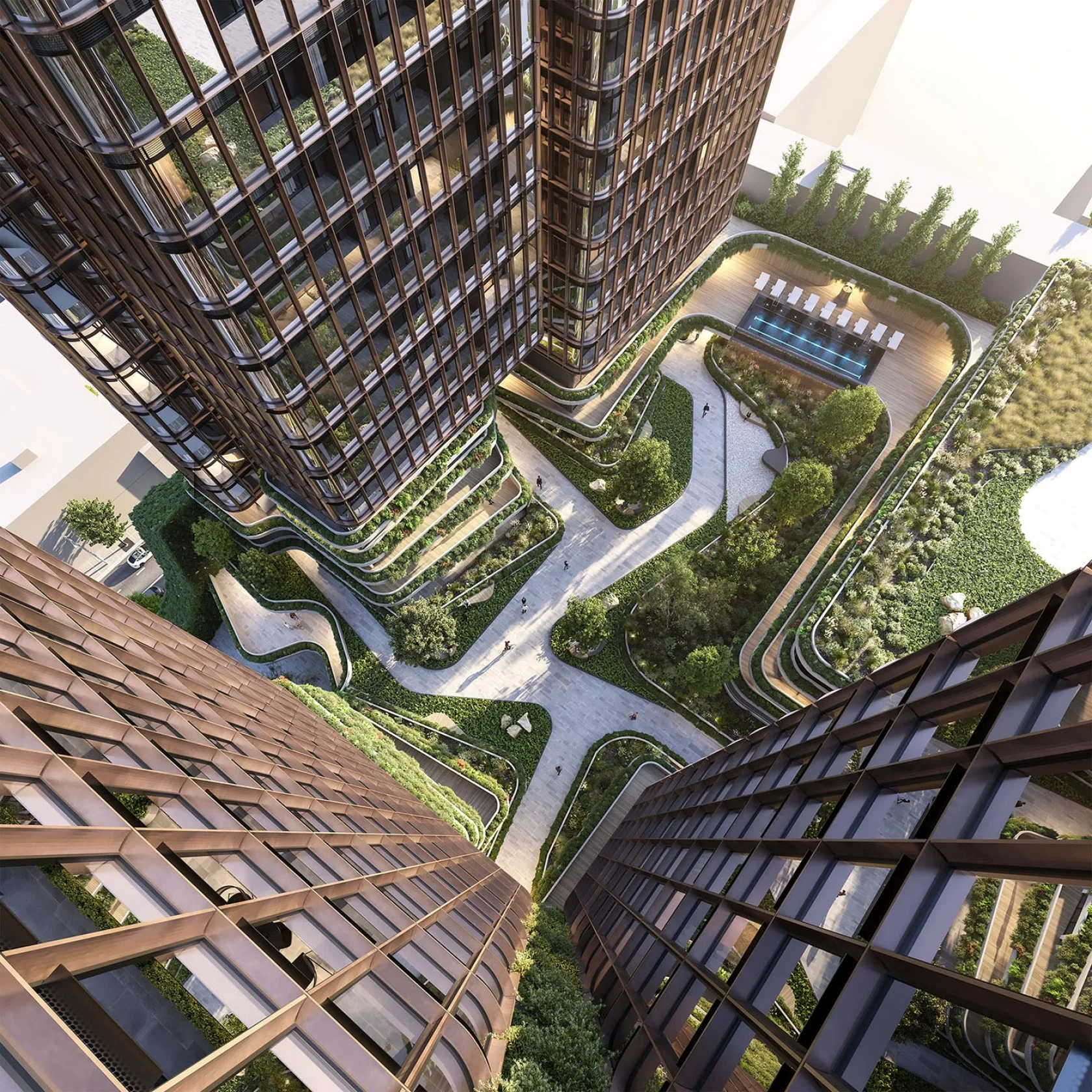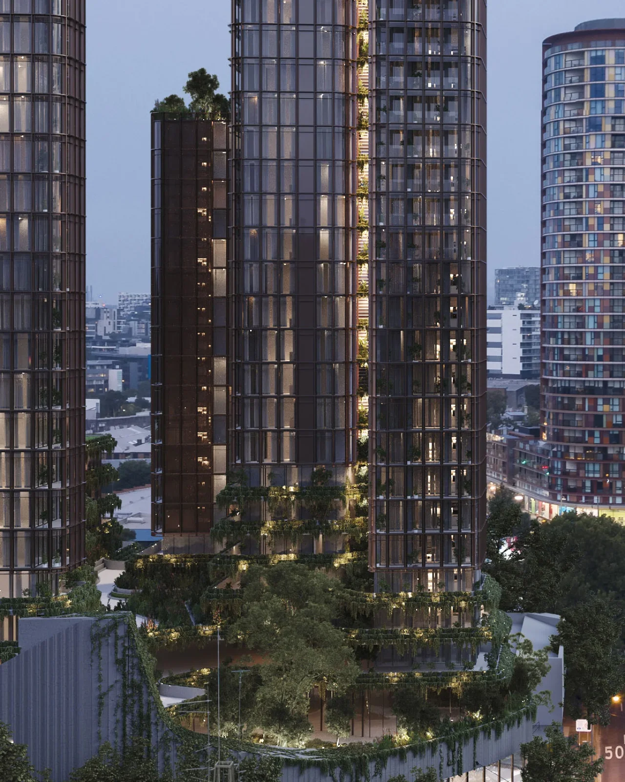 The proposal comprises of a series of slender tower-forms arising from a topographic landscape layer. The predetermined podium design by SJB has informed this landscape cloak and works as a mediator between the two design proposals in both form and function. The integration of communal facilities, car and bicycles parking, private open spaces and commercial tenancies into the landscape layers contributes to amenity while further reinforcing the concept.