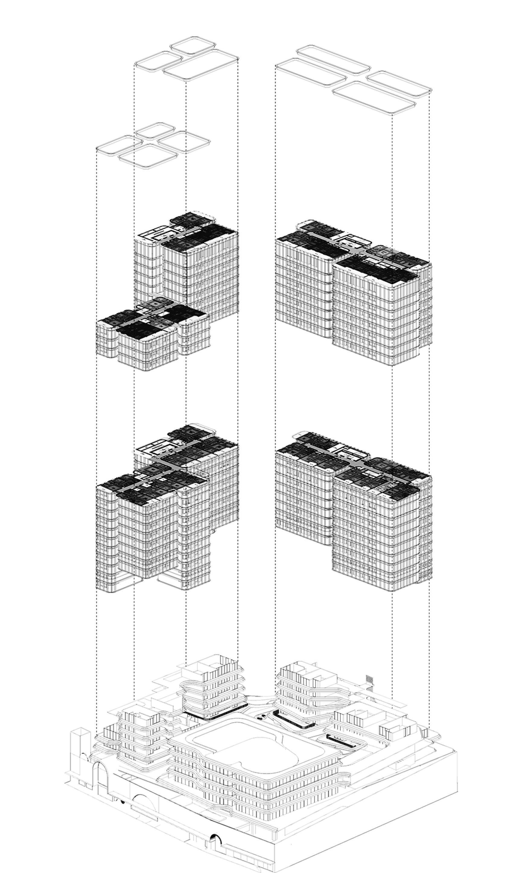 The proposal seeks to morph a two dimensional podium silhouette into a sculptural, programmable landscape deck. In order to achieve integration, all elements of the architectural and landscape design of the tower are derived to some extent from the podium, translated into a dynamic, contemporary tower form.