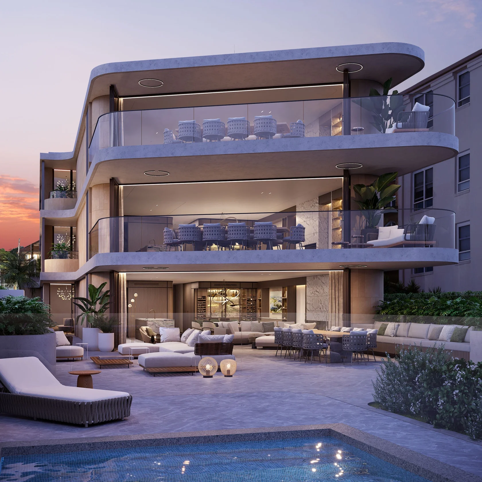 The built form is perfectly captured in the curved features and fluted highlights and enhanced through sweeping glass, thin industrial metal frames, rounded stone and formed timber.