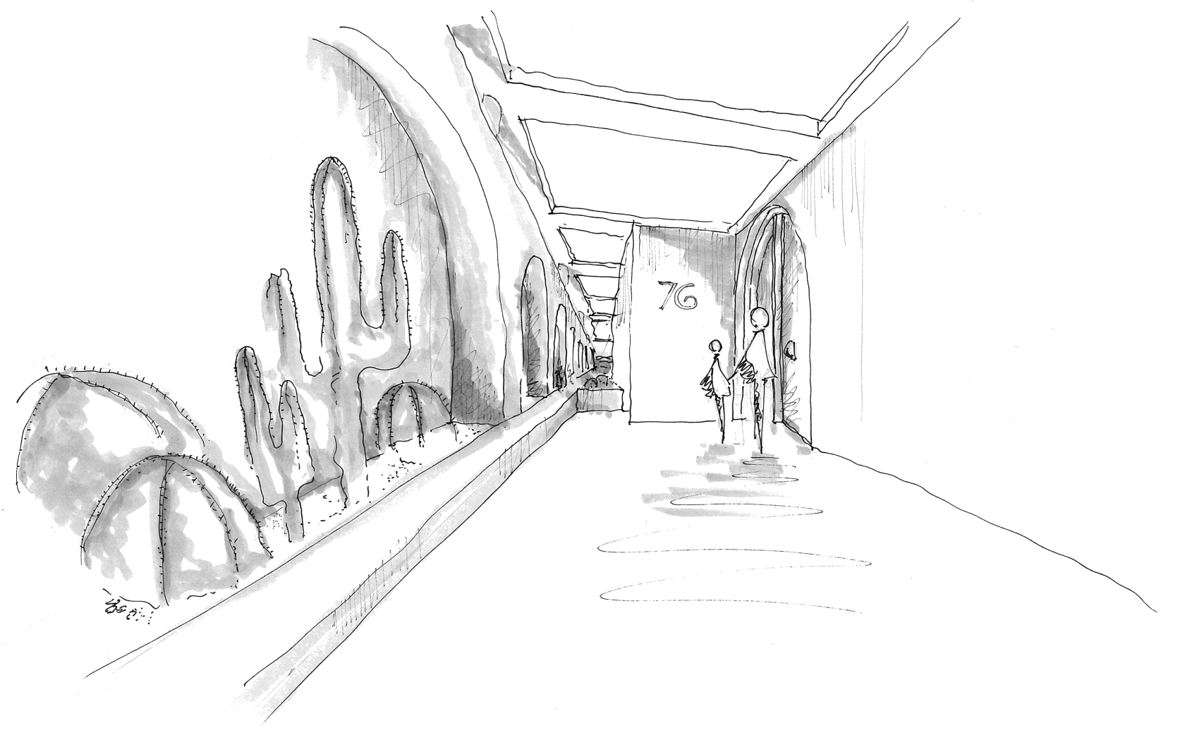 The outdoor spaces are finished in textured stone matching the interior, unifying and extending the indoor and outdoor spaces.