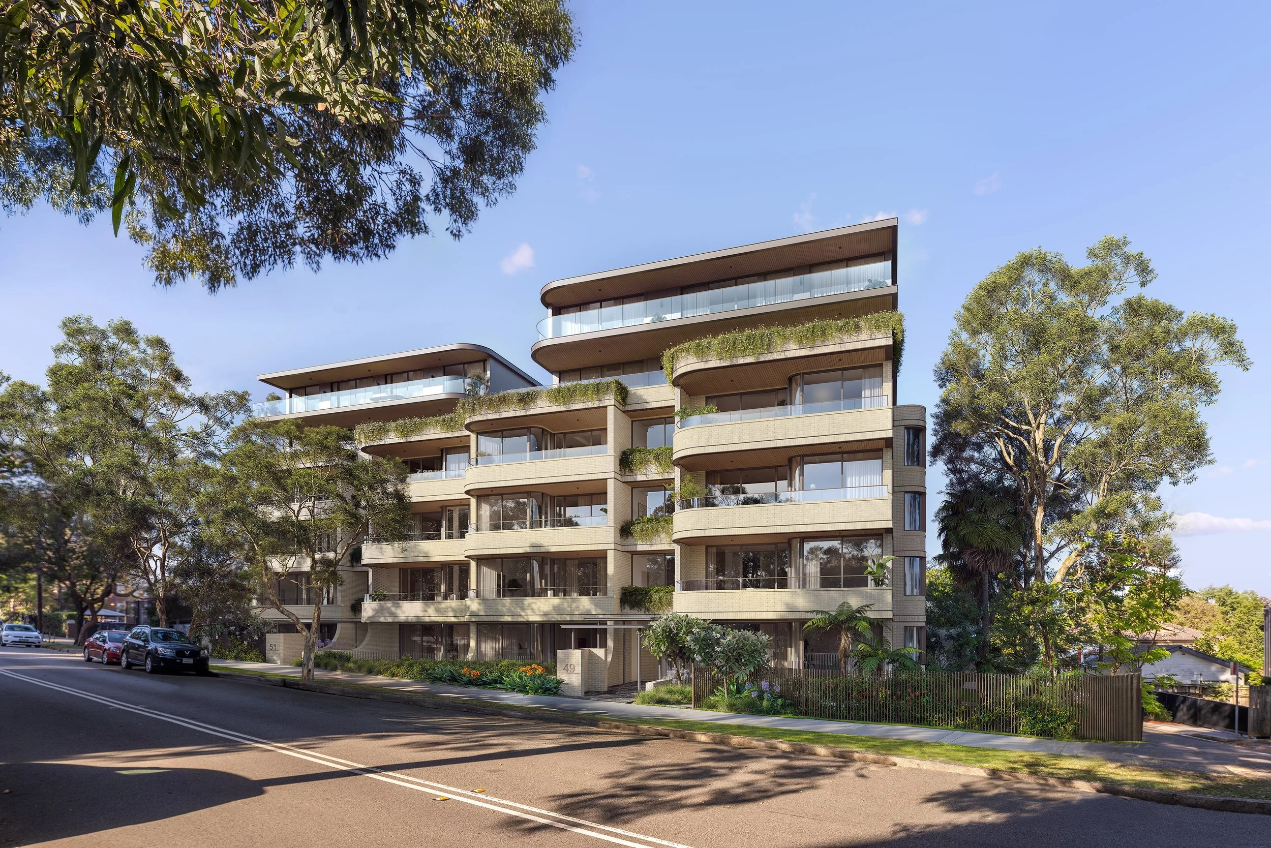 The design emerges from a careful reading of the land, responding to its subtle diagonal slope while respecting the scale and rhythm of the surrounding streetscape. The building’s form flows with the site, balancing a clear architectural language with a sensitivity to its neighbours. Curved slab edges within vertical bays introduce a horizontal rhythm, softening the overall mass while giving the façade a sense of movement and refinement. Materials and detailing have been chosen to complement the setting, bridging interior and exterior with textures and tones that resonate with the landscaped surroundings.