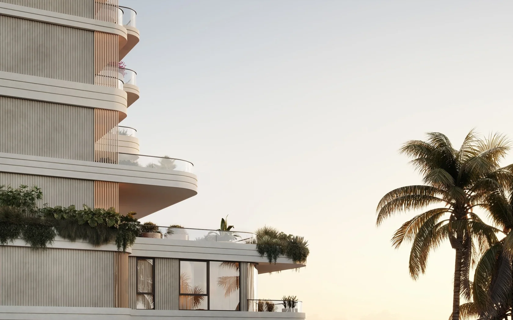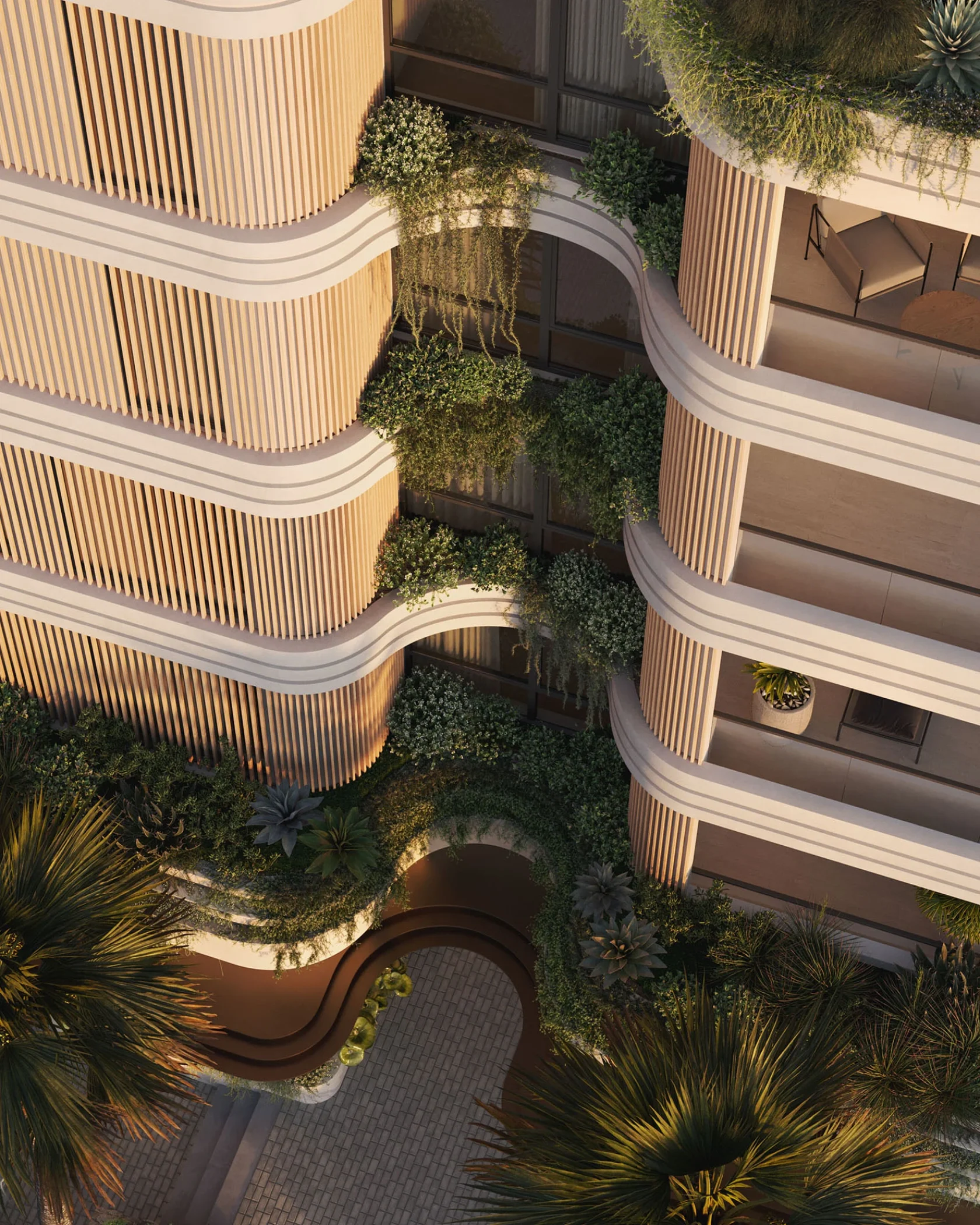 The design is characterised by undulating contours and rounded edges, across the faΓ§ade, bronze battens imbue rhythm and depth while affording added privacy to the residences. The podium represents a grounded look with heavier balcony banding treatments wrapped around with greens planting spilling over, while the floating balcony slabs on the upper levels feature tapered vertical battens that form a central spine accentuating the verticality and light expression of the design.