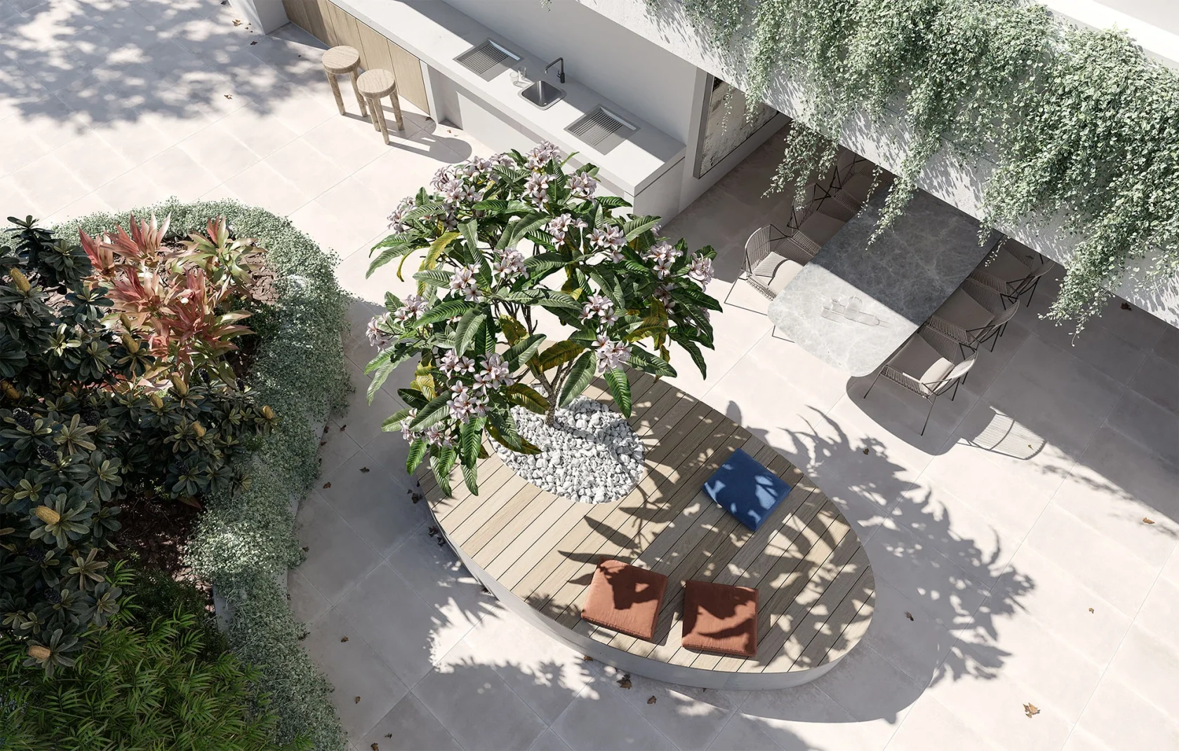 The highly-articulated Ozone St, Ocean Grove Rd and Cecil Monro Ave facades incorporate carefully-designed building elements such as the projected slab edges, pre-cast concrete upturns, clean glass balustrade, graceful curved edges and entry point, 6-storey high elliptical columns and vertical privacy screen to add more texture to the overall building presentation.