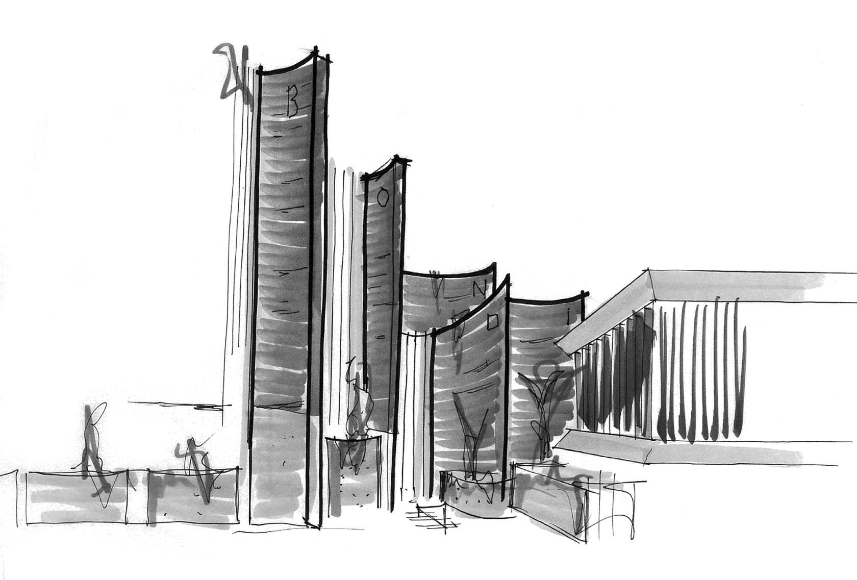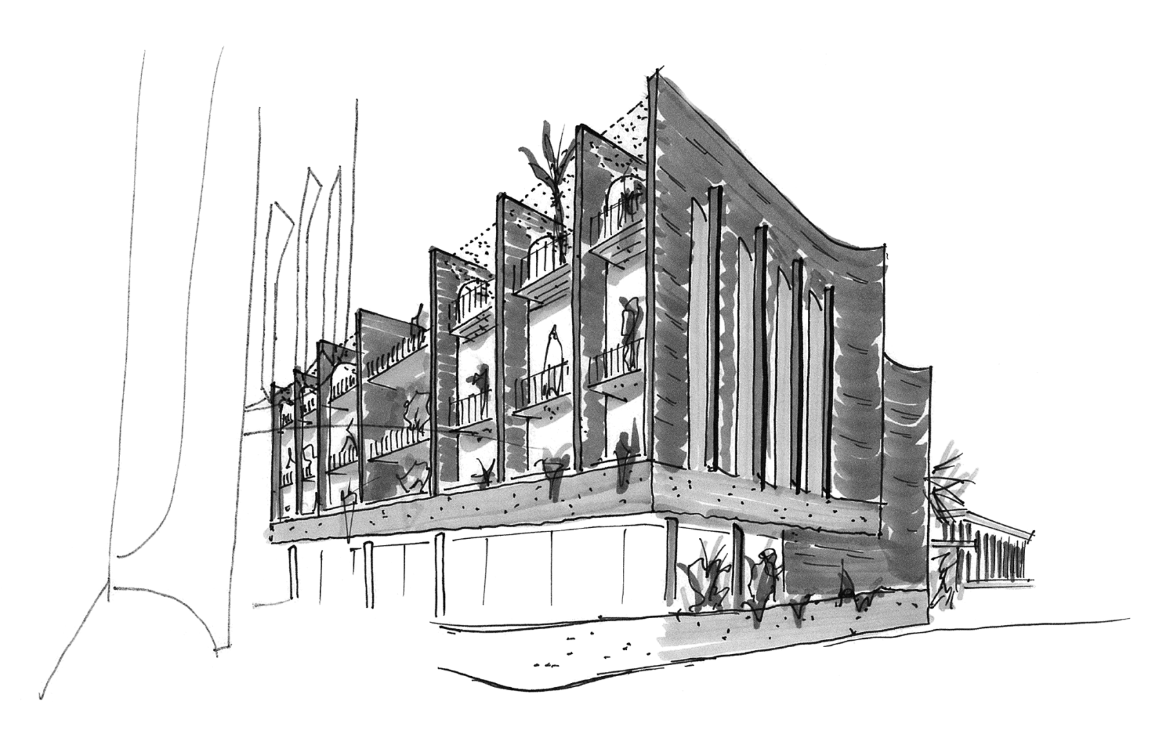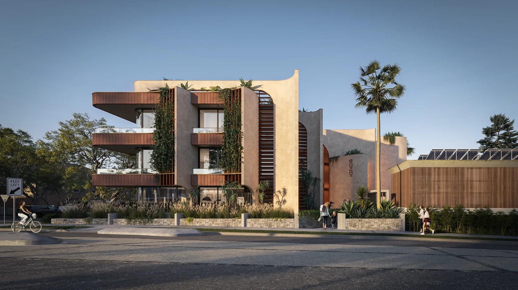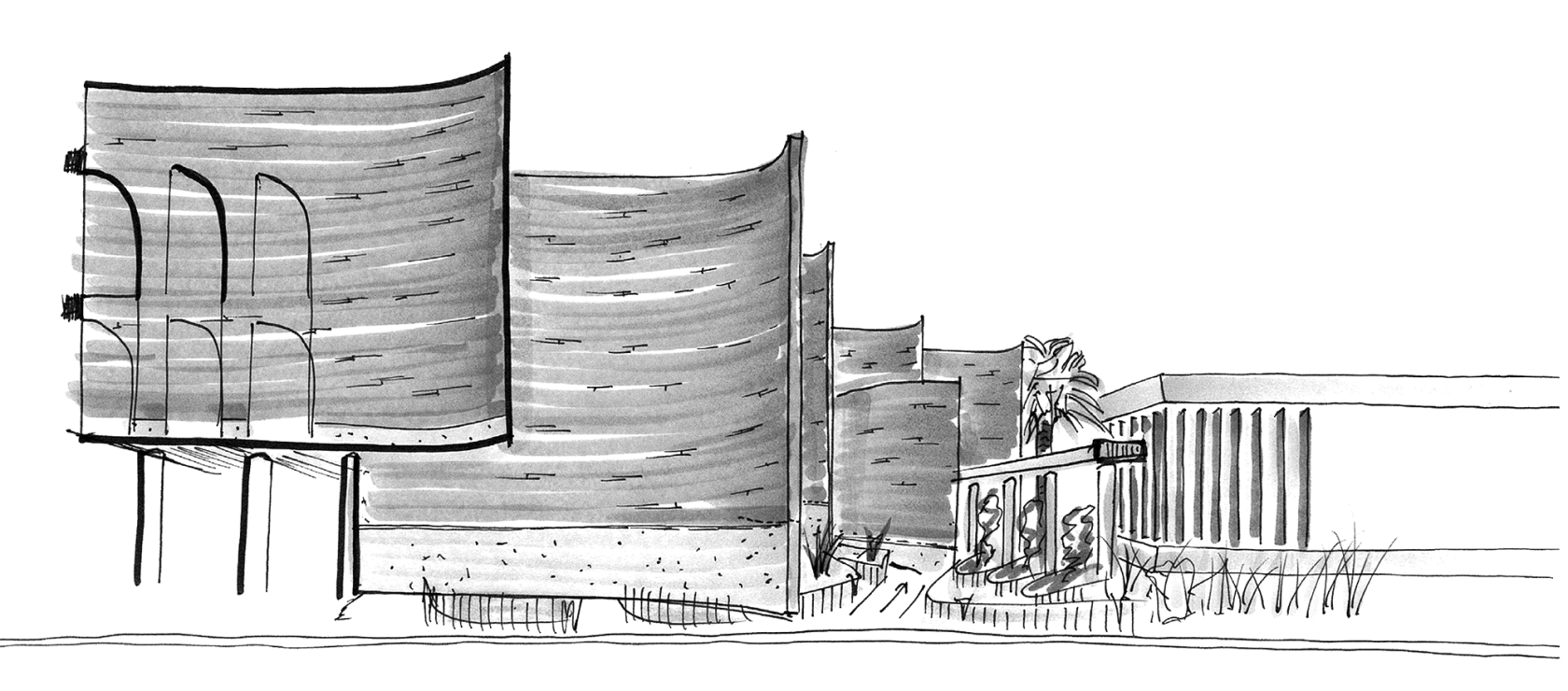 The language transitions along O'Brien St, whereby a stage of individually sculpted blade walls formulate the entry forecourt.